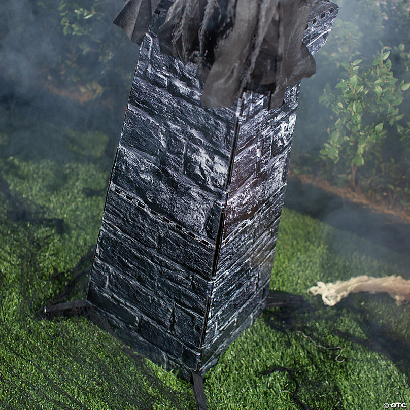 This reaper decoration, which features a skeletal reaper with its arms wide atop a column that looks like bricks. Fabric wings are curled up behind its dark black robes. The stark white, grinning skull is sure to delight party guests and trick-or-treaters when you set this out in your yard decorations or Halloween party entryway decor. Pair this with other decorations, like foam gravestones, hanging ghosts and more Halloween essentials (sold separately on our site!) for a truly otherworldly scene this Halloween. This standing decoration makes motions when activated. Batteries required.