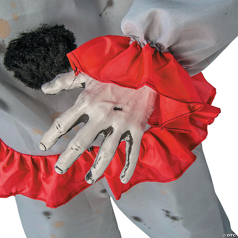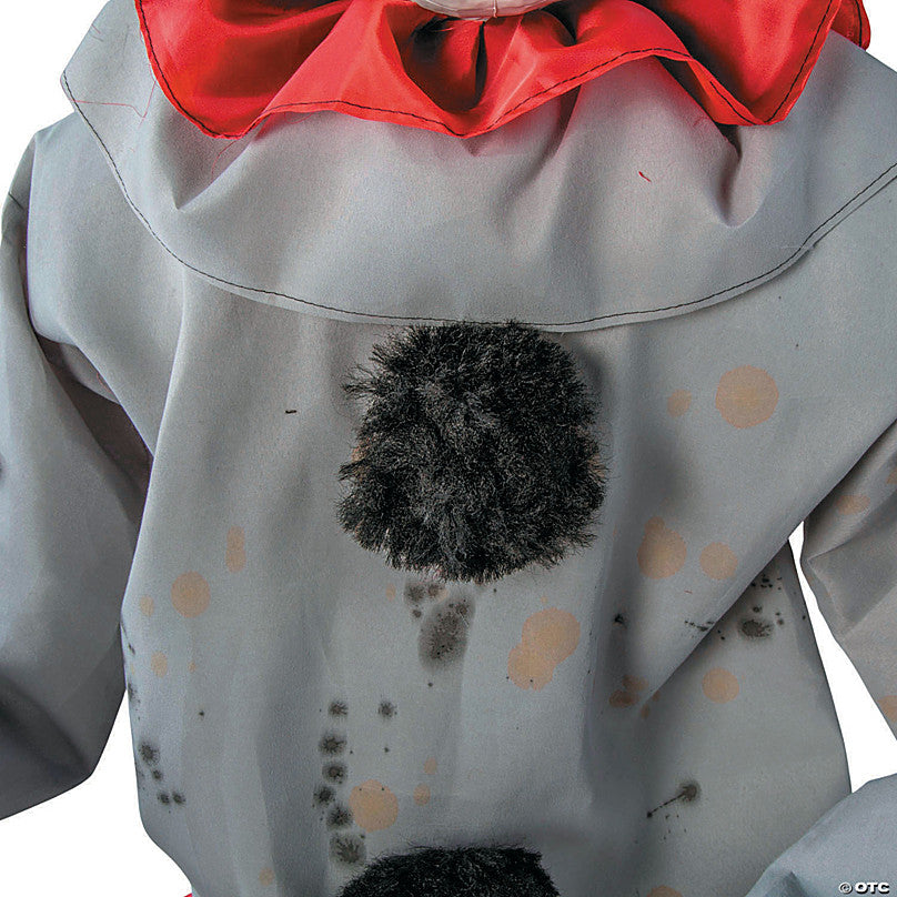 Enhance the creepy vibe in your Halloween displays with this animated clown! The standing clown Halloween decoration features a gray clown suit with red trim and black pom-poms, black shoes and stringy black hair framing a face with an evil grin. The figure holding a metal-wrapped bat makes it a scream-worthy addition to haunted house setups, front porch displays and photo booth opportunities and is sure to up the fright factor for all who see it. Requires 4 AA batteries, included.