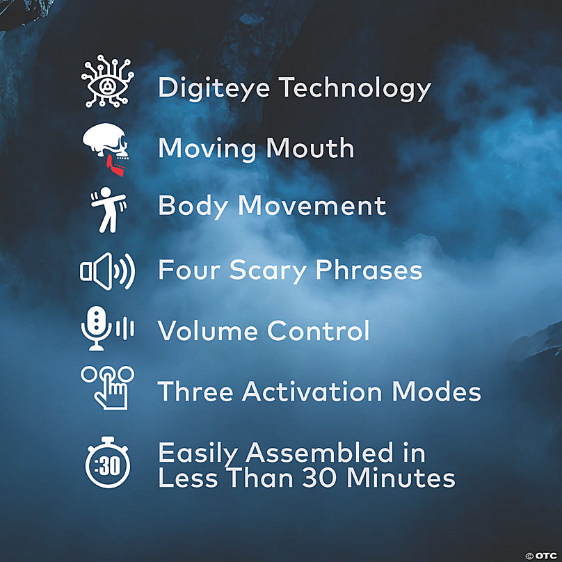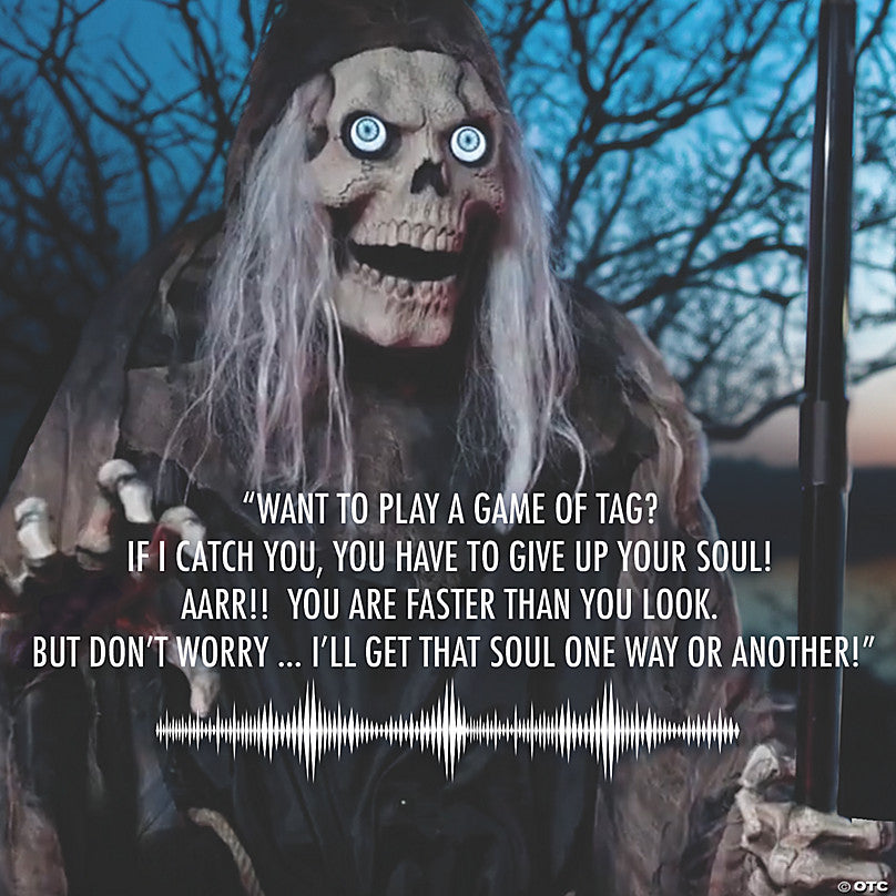 He always knows when your time has come! The 6-foot Lunging Reaper Animated Prop with patented Digiteye technology will add the element of surprise to your next Haunted Scene! His amazing pale eyes appear to look around, and his Mouth Moves as he says 4 scary phrases:Phrase #1: "Want to play a game of tag? If I catch you, you have to give up your soul! Aarr!! you are faster than you look. But don't worry, I'll get that soul one way or another!"Phrase #2: "Do you think that you can sneak past the reaper? I always know when your time has come&hellipGotcha!! Hahahaha Lucky for you, it's not your time&hellipyet hahahaha!"Phrase #3: "The living never think that their lives will come to an end, but all it takes is one touch from me &ndash ooh hoo hahah!! You have escaped my grasp&hellipfor now hahahaha!"Phrase#4: "I have come to guide one of you into the afterlife. Come into my embrace and meet your fate!! Hahhaha don't worry, I will return for you soon enough!"Holding his Plastic Scythe, at the moment you least suspect, The Reaper Lunges toward you! Three activation options include, Steady-On, Infra-red Sensor, or Step-Here Pad. There is also a volume control so you can adjust to your surroundings. Constructed of durable metal rods that snap together, this piece is easily assembled in less than 30 minutes.The included Universal Adapter has 4 interchangeable plugs, and works in the USA, UK, Germany, and Australia.