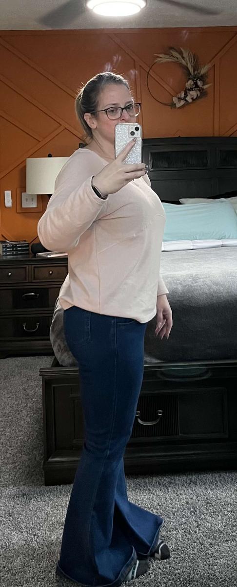 Love these jeans. I was looking for a light wash with a more relaxed fit and these are boot cut, but once you wear them a little bit they stretch so they are super comfortable. I sized down and they fit great. I’m 5’6 and they are a perfect length for flats but still long enough for a boot.