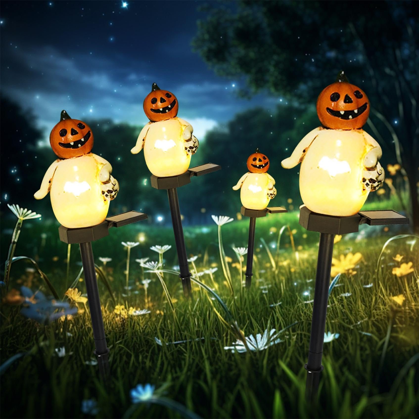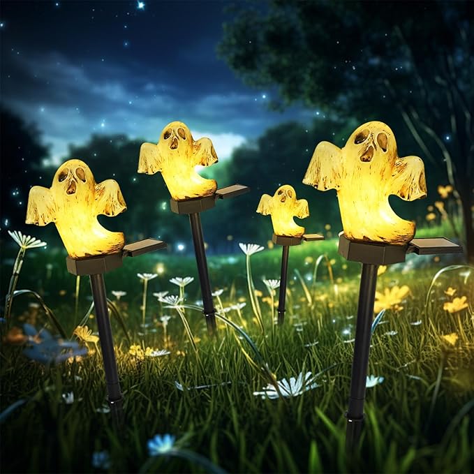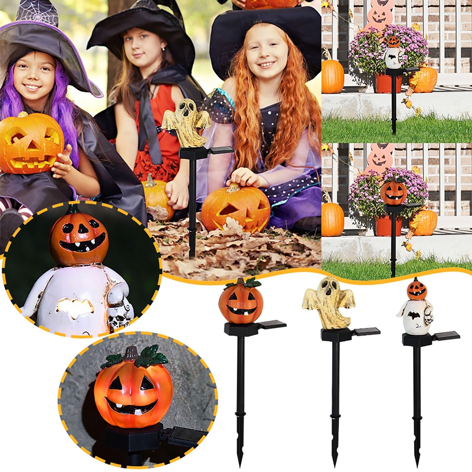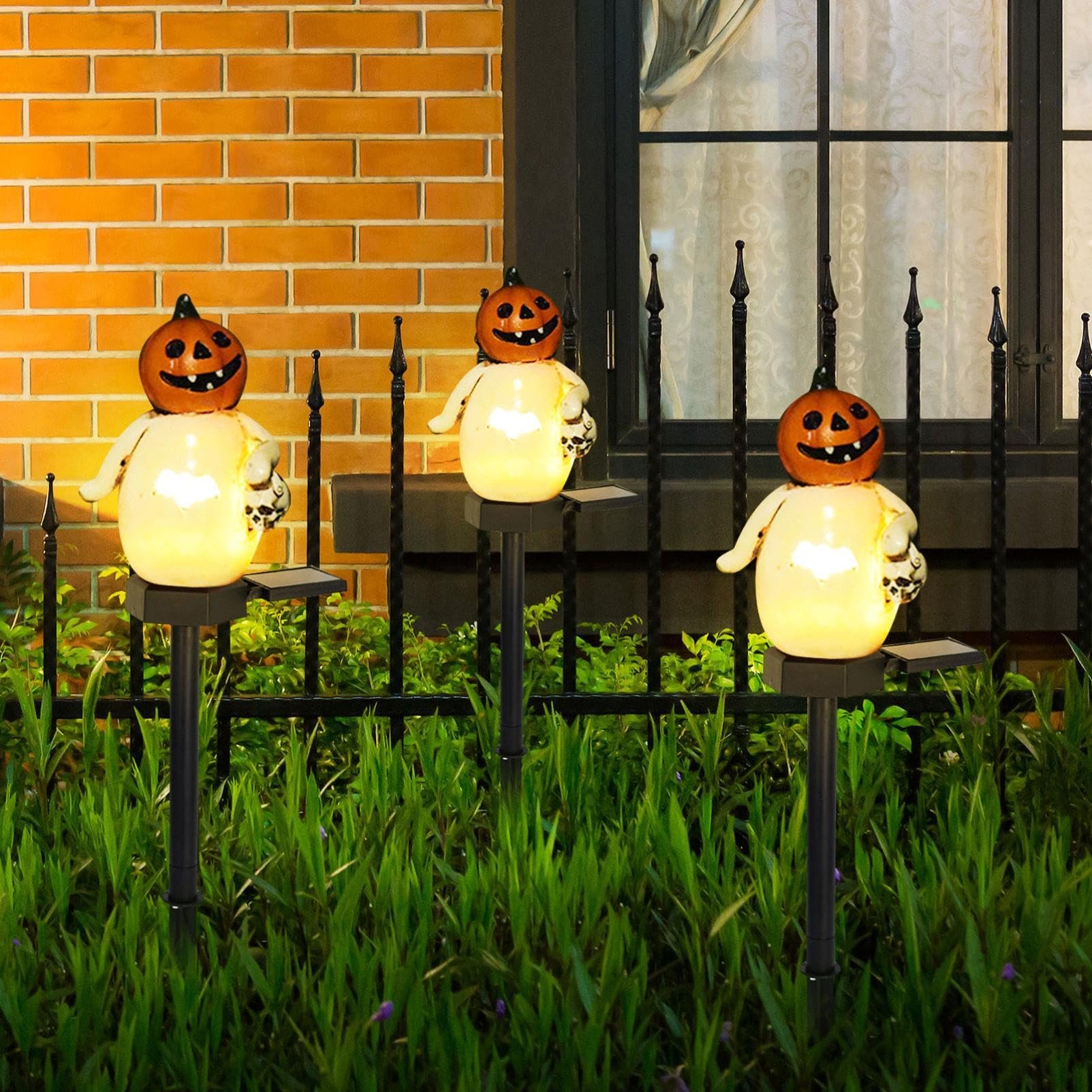Spooky Design:Horror themed solar garden lights. The garden lights use unique ghost, pumpkin, skull and other Halloween elements to add to the festive atmosphere.